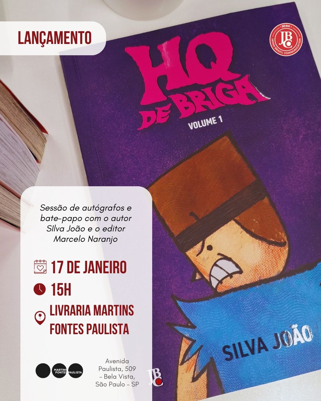 A Editora JBC e a Livraria Martins Fontes promovem o evento de lançamento da HQ de Briga com bate-papo e sessão de autógrafos com o autor Silva João. O encontro é aberto ao público e acontece no dia 17 de janeiro de 2026 (sábado), a partir das 15h.